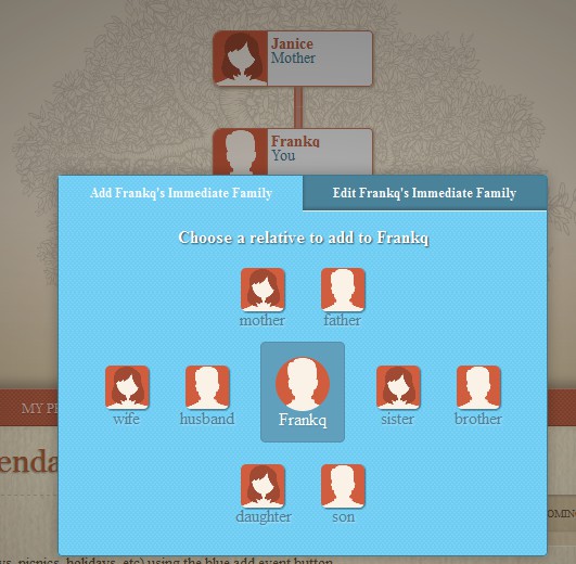 First thing that you need to do is register on the website. Login and you should be presented with the started family tree, which you can see in the first image above. You will be in the center, and to add a new family member, hover with your mouse over your tile. Plus sign should appear in the top right corner, click it and add new family member should appear.