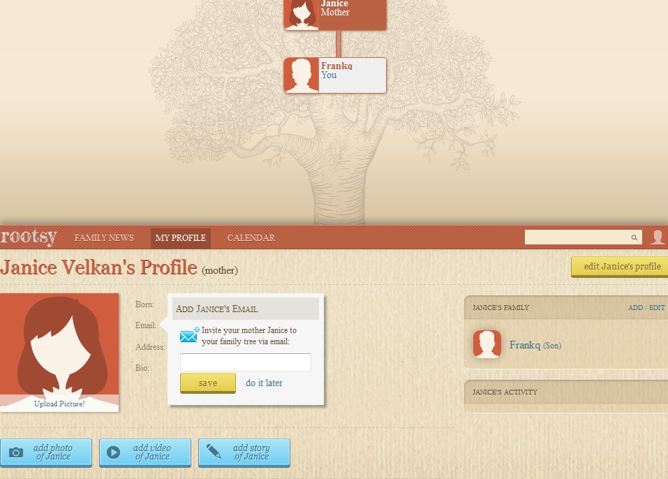 All the necessary tools are gonna be listed down below, at the bottom of the interface. Those three blue buttons are for adding images, videos, or stories. When you’re creating new family members their email can be typed in and they can be invited.