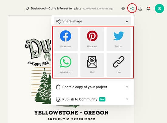 8. Alternatively, you can click on the ‘Share’ icon to share your design on social media platforms like Facebook, Pinterest and more. You can also choose to share it via Email or copy a Link (URL) to your design that you can send across to others.