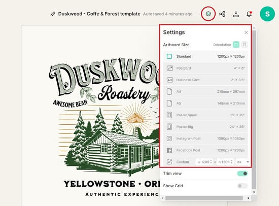 3. Click on the ‘Settings’ icon at the top toolbar to specify the size of the graphic.