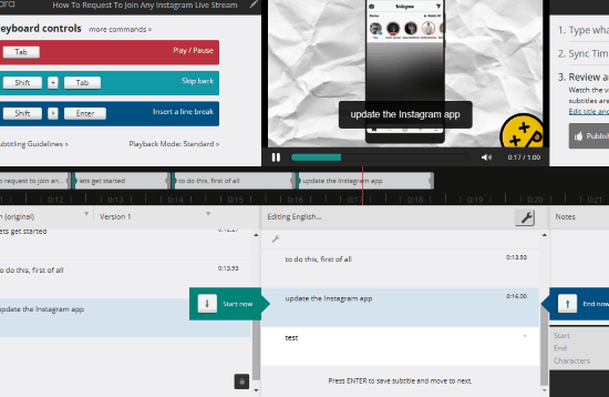Amara is an advanced subtitle maker which lets you create subtitle online. It supports YouTube, Vimeo, MP4, WebM, FLV, and OGG videos to add subtitles. Just like Subtitle Horse, you can only add videos that are available online. You will have to provide a video URL in order to load it.