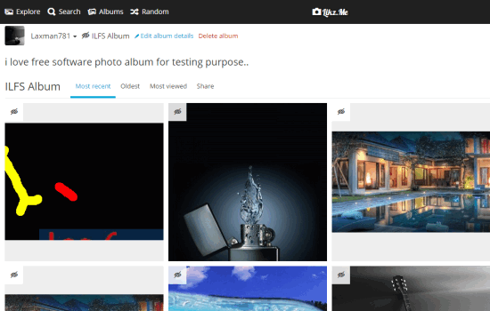 Likz.Me is a free photo sharing website to upload and share jpg, bmp, png, and gif images. You can bulk upload images to this website with maximum 30 MB per image size. It helps to create public and private albums to store and share uploaded photos. Public photos can be viewed by anyone where private photos will be accessed by users having your album link.