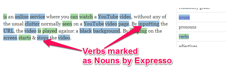 This free writing style checker impressed me more with the representation of the part of speech used in the text. With Expresso, just with a click you can check percentage of all parts of speech in your texts. For example, to check all the nouns present in the text, you need to click on the ‘nouns’ in General Metrics (check the screenshot below). As soon as you click on “nouns”, all the nouns present in the text will be highlighted.