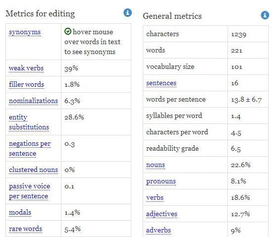 After you have copied your text in the interface of the website, one click on “Analyze text” will show detailed quality report for your text. Report will have two set of metrics, namely: Metrics for Editing and General Metrics.