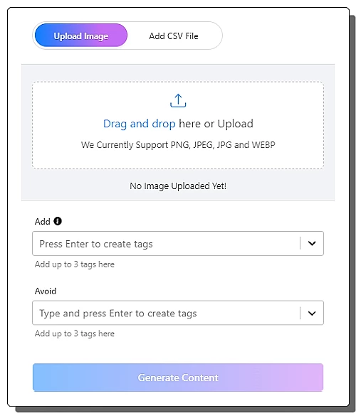 The tool loads an upload screen as shown in the screenshot above. It has two upload options; Image and CSV. The free plan only allows 1 image upload at a time whereas the paid plan lets users add multiple images or import the entire product catalog via CSV import. Along with the product image, users are also asked to provide up to 3 tags that they want to add as well as up to 3 tags they want to avoid. This is optional but if users want to include or avoid certain tags, this can help them do that. With that, users can submit the input to generate content.