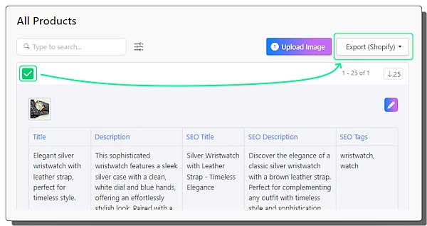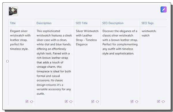 The tool takes a few seconds to generate the content from the product image. It loads a table on the screen covering the Title, Description, SEO Title, SEO Description, and SEO tags. Each of these sections in the table has a re-generate and edit button at the bottom. These buttons allow users to generate more drafts and make any edits to the content. I tested the tool with a product image of a wrist watch and the output was quite good.