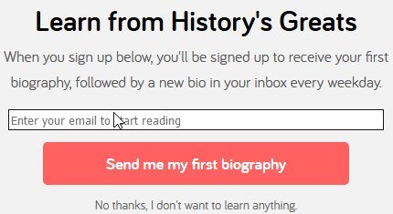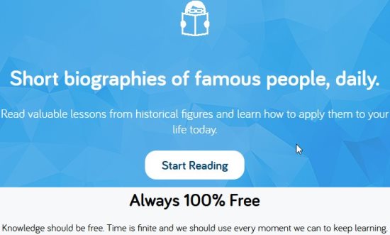 Biography Daily is a free website which will send random short biographies of famous people daily to your inbox. All you need to do is provide your email address and you will get a short biography delivered to your inbox everyday. I like reading Biographies as they let you know about famous people and their lives. They also are a great source of inspiration. Anybody who likes reading would love this website. The biography is kept short so it does not take too much time to read and you come to know about some really inspirational stories which you might not have heard before.