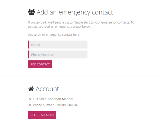 Once the details have been filled you reach the landing page of Kitestring.io. The page has very simple layout which is easy to understand. You have to insert at least one number in the “Add an Emergency Contact” to use the features of this application which checks up on you. Remember the phone numbers you are giving should be in E.164 format.