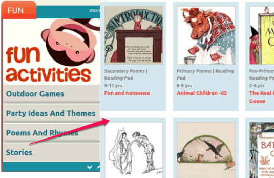As the name suggests, this section contains a lot of fun activities. There are fun twists which includes tongue twisters, animal facts, and palindromes. Arts and Crafts option is also present where you could learn how to create/draw an item (say dolphin, hanger faces, etc.) with step by step instructions and a tutorial video. Not only this, you can read poems and rhymes as well. A good collection of stories is also present here which you can read online.