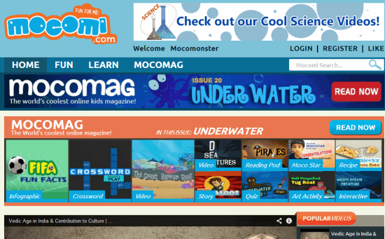 There are mainly three sections available in this website: FUN, LEARN, and MOCOMAG. Lets have a look at these sections: