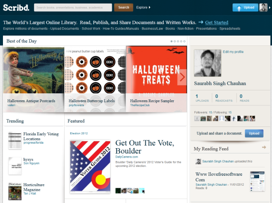 Getting started at Scribd is simple where you can easily create an account via Facebook login. After login, you will be able to read eBooks online, import Google documents, upload eBooks/documents, share them and may even opt to sell your books online at Scribd.