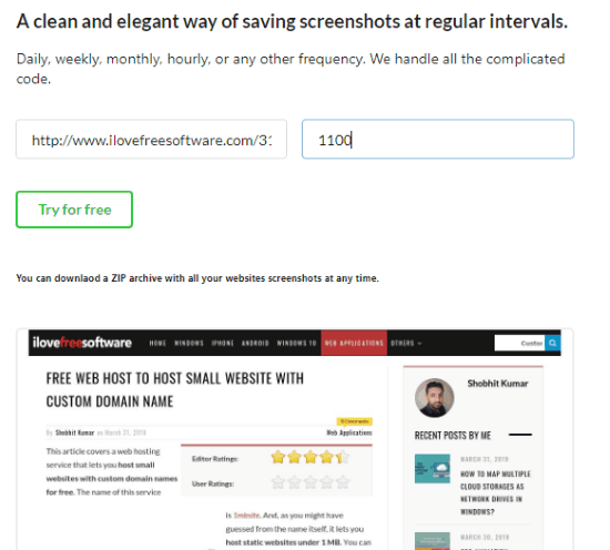 In this blog post, you will know how to take automatic screenshots of webpages at fixed time intervals online. LongLiveSS is a free website that helps you save webpage screenshots. You can capture webpage screenshots without signing up as well. Without signing up, the site lets you take an instant screenshot of a website. Also, you can set the custom size (width) of a webpage in a screenshot. Thereafter, you can save the image as JPEG format.