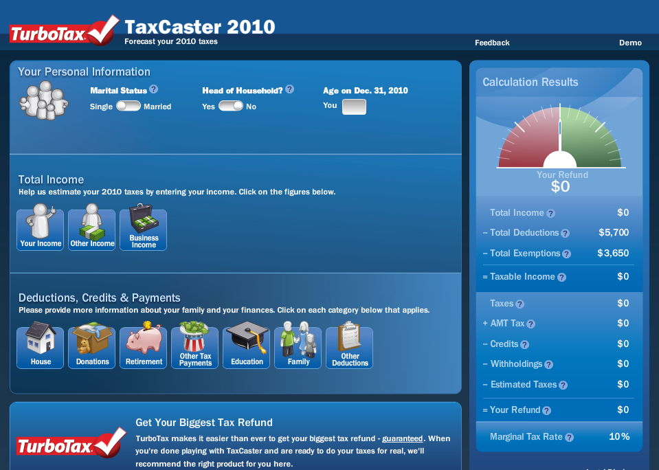 TaxCaster 2010 is a free tax calculation tool by TurboTax Free that gives you the fastest way to get an estimate for your tax return. TaxCaster by TurboTax is very simple, user friendly and covers everything in just one page. All you have to do is enter some basic tax related information and you will be shown whether you will get a refund or owe money.
