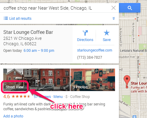 Step 3: When all the available places will be visible to you, select a particular place. Now you will find Street View option for that particular place, if available. See the screenshot below:
