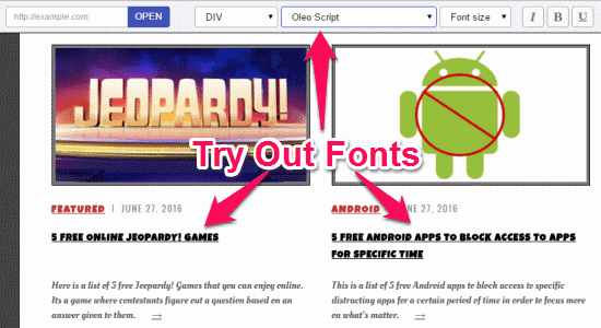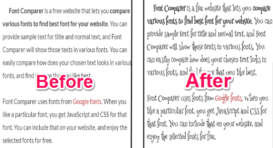 To try out different fonts on your website, all you got to do is enter your website URL, select which text you want to change (like title, body, link, etc), and choose your preferred font from the pre-defined list, that’s all. It offers tons of text fonts listed in different font family like Serif, Sans Serif, Display, Handwriting, and Monospace. Similar to other applications like Type Genius and Font Comparer, this one also helps you easily visualize how a particular font will look like on your website.