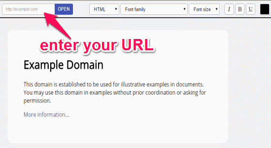 Step 1: Simply go to the homepage of “Font Fit” and you’ll see various text formatting tools like font size, italic, bold, underline, font family, font color, etc. at the top of the window. There will also be an input field at the top-left corner associated with an “Open” button. To get started, simply enter your website URL or a link to any of your web pages in the input field.