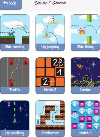For creating a game, you will get options for what type of game you want to create. As can be seen in the above screenshot, you can select a game type like running, jumping, flying, traffic, matching, etc. Once you select a game type, you can proceed to the next screen.