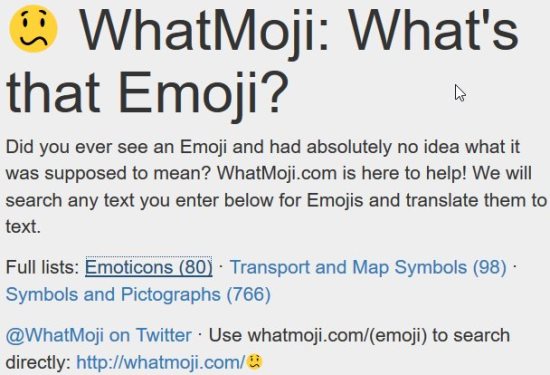 WhatMoji is a free website which lets you know the meaning of Emoji. Now a days we use emoji to express emotions while chatting or updating a status on social networks. Emoji have become a norm for expressing anything and everything. But with so many emoji out there sometimes you wonder what they actually mean. Even when one of your friends updates a status using emoji only, you wonder what they are trying to say. Because frankly we do not know what all those cute emoji mean. So for that we have WhatMoji, a website which will tell you the meaning of any emoji you come across.