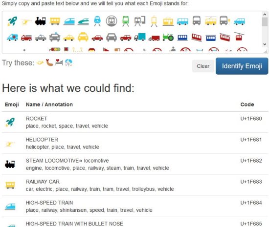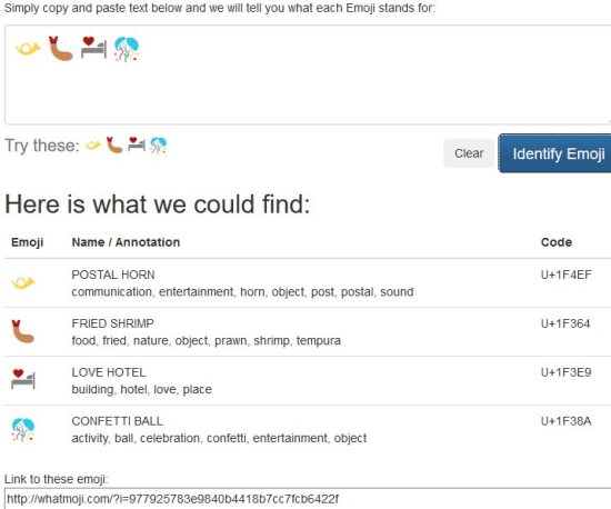 The website doesn’t translate a emoji sentence completely, but tells you what each emoji in the sentence means. As you see in the above screenshot each emoji name, annotation and code is displayed by the website.