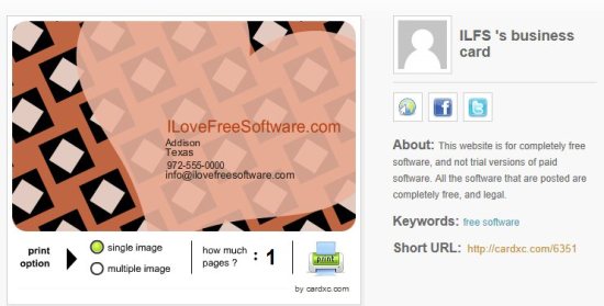 Here is a sample online business card made using Business Card 2 http://ilovefreesoftware.businesscard2.com