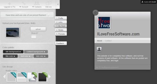 DooID is free web application that helps you to create interactive profile online with easy registration. You can create business card online with this freeware, along with your photo and description of your business. It helps you to create your personal business card which helps you to share your contacts with potential clients of other networking websites.