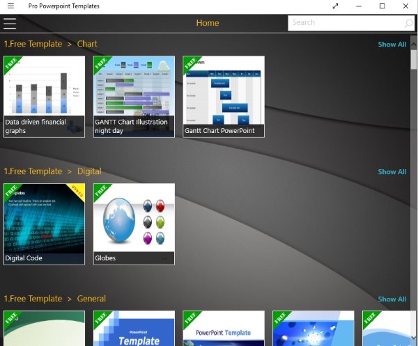 We all make PowerPoint presentations to present our work in a professional manner. Be it students, or business person everyone needs to use this tool sometimes. PowerPoint offers you preset templates in it to make a great looking presentation. But what if you want something different from the standard templates that PowerPoint offers. This is where this Windows 10 app comes in handy. The name of the app is Pro PowerPoint templates. Your wish of better looking, cool templates is fulfilled by this app.
