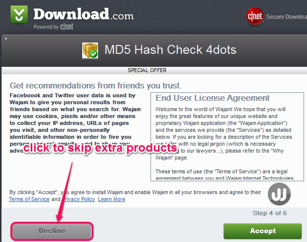 You need to download MD5 Hash Check to your PC. Its homepage provides both installer as well as portable version. If you choose to install it on your PC, then it will be installed using an installer, which is ad-supported. So you need to use Decline button and choose Advanced installation mode to skip installation of extra products (like outobox, wajam, etc.).