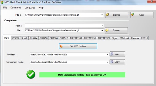 Now to check integrity of files, you need to add a first file using Browse button. You can even drag n drop a file directly on required place. After this, choose a hash option. By default, it will let you generate MD5 hash, but you can switch to any other hash option accordingly. After this, use available button (Get MD5 Hashes button for MD5 hash option) to generate hash value. In the similar way, you can add another file and can generate that file’s hash value. If hash will be the same, it shows integrity is OK, otherwise it shows integrity error, just like visible in screenshot below: