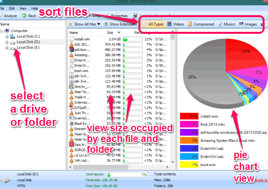 It also provides a beautiful pie chart view for finding out the hard disk space occupied by different types of files. You can either select all types of files, or can choose only a specific type of file, like image files, documents, compressed (zip archive), music files.