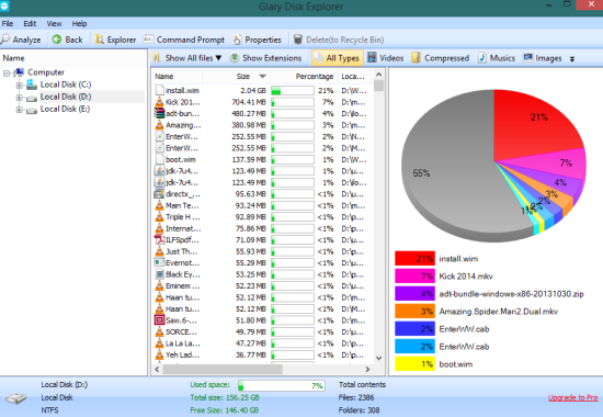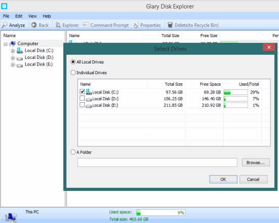 Glary Disk Explorer (a product of Glarysoft) is a handy disk space analyzer software to check large files and folders present in your PC. It helps to quickly check size (in percentage and in MB/GB) of files and folders present in your hard drives. It can start analyzing hard drive(s) in a single click and show space occupied by each individual file and folder.