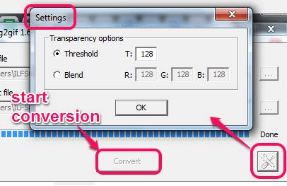 Step 4: This is an optional step which helps to set Transparency options by adjusting the threshold value or by setting the RGB value to desired number. It won’t affect output gif much, so you can perform experiments.