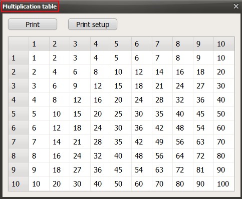 Multiplication Table is a free application for kids to learn multiplication tables in a more easy way than that of books. You can create a multiplication table chart of your own where you can add values (x and y point) from 1 to 100. Here you can also increase/decrease the value of chart and can learn tables either one by one or all tables in a single table chart. Thus it’s a very simple application that will help kids to memorize multiplication tables and there is a print option also present to take printout of table chart.