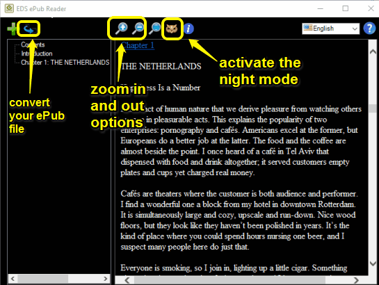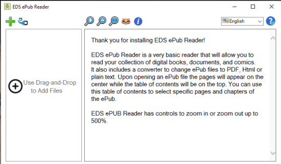 Here comes a good and free ePub reader and converter software, known as EDS ePub Reader. The software has a very simple interface, but it comes with some really good features. Apart from adding and reading an ePub file on its interface, it lets you convert your ePub file to PDF, TXT, and HTML.