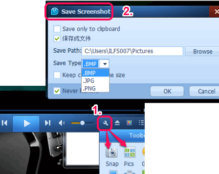 - Snap and Pics: These are two different but similar features. Snap feature lets you capture a full snapshot of playing video. You can also use hotkey ‘Alt+A’ to capture snapshot and save the screenshot to needed destination location. Screenshot can be saved as png, jpg, and bmp.