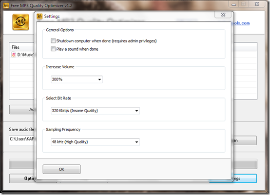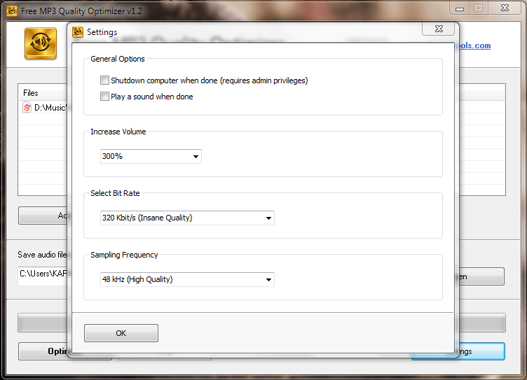 The interface is fairly simple. All one needs to do is Add the desired MP3 file and tweak the options from the ‘Settings’ Menu. You are also allowed to change the destination folder of the end result. The application allows you to change the quality of the bitrate from 128 kbps to 320 kbps as well as the sampling frequencies ranging from 32 kHz to 48 kHz. You also have the option of being notified when the optimization process has ended by means of a ringing tone as well as a Shutdown feature which requires administrative privileges.