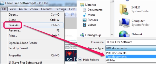 - You will also be able to extract text from PDF document. For this, you need to use File option and then select Save as option. Then at the time of saving the document, you can select text document file type and only text will be saved from your pdf document.