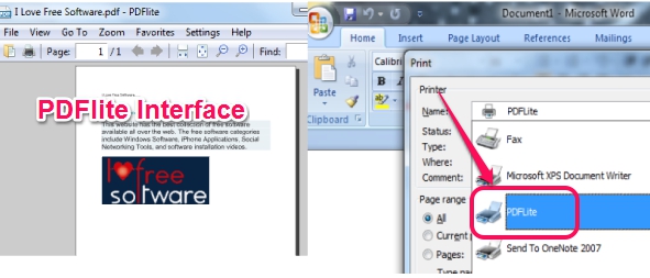 In above screenshot, you could see PDFlite Interface and its virtual pdf printer option that will be available with almost all applications that provides printing feature.