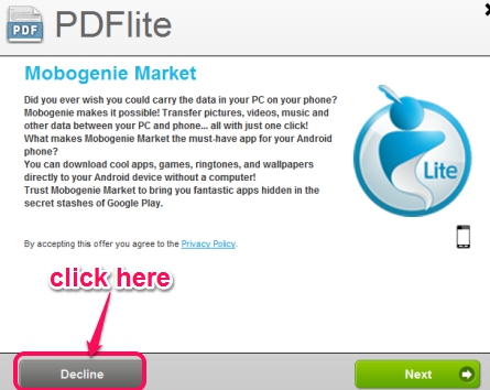 Download PDFlite to your PC and install it. It will be installed using an installer. Be careful while installing it as many extra tools (mobogenie, foxtab, MySearchDial, etc.) will come in installation process. You can ignore those 3rd-party tools by clicking the Decline button and using Advanced installation.