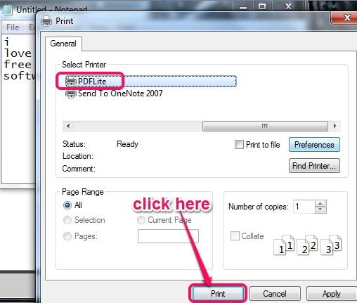 - Once you have installed PDFlite to your PC, it will also provide a virtual PDF printer automatically to convert text or word files into PDF documents. To use this feature, open any application, say Notepad, and use Print option. There you will find PDFlite printer option. Select this option and hit Print button. Then, instead of taking print out of that text file, it will let you convert & save text file to PDF at desired destination location.