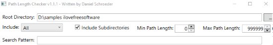 On its interface, add the input folder using the Browse button. After that, you can set options as per your wish. For example, you can set minimum and maximum path length, include/exclude sub-folders, and include only files or only sub-folders. Set these options or continue with default settings.