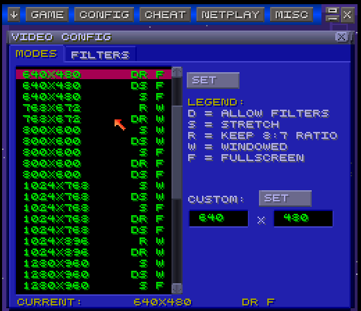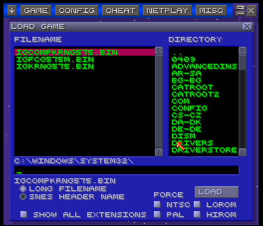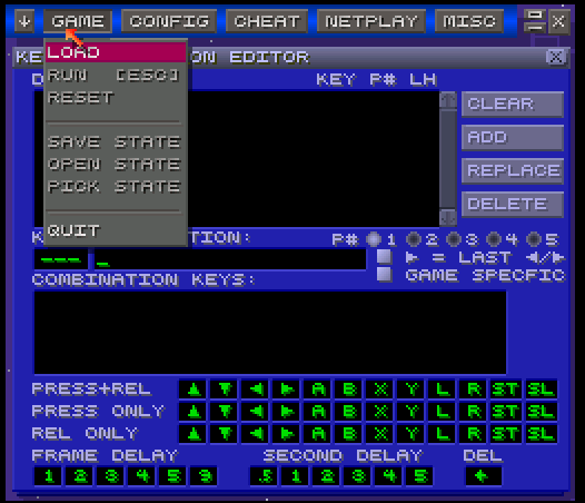 The first tab of Game is used to Load a game and Save a State, Pick a State or Open a State. With the Config tab, you can configure your CPU parameters. Speed, Audio-Video settings, Destination Paths, Chip’s; everything can be controlled from here. With the special feature called Cheat, you can browse and search the existing Cheat Code book; while the option of adding your own Cheats exists too! Netplay is concerned with Internet connectivity. GUI options and the Key configuration can be edited with this tab.