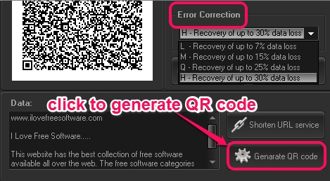 These levels help to recover from data loss (higher the level, more will be the data recovery), if data is damaged during print out or code image pixels are corrupted. Screenshot above shows interface of this QR Code Generator freeware which is very simple.