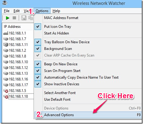 Step 1: Open the Wireless Network Watcher software. Then go to Options > Advanced Options or press F9 (short cut key).