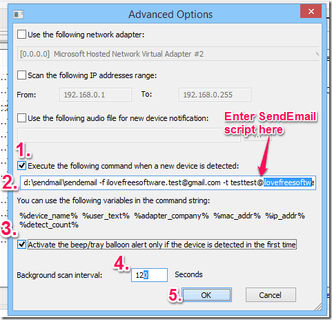 Step 3: Now, check mark last option in the advanced option says “Active the beep/tray balloon……” to receive sound and system tray notification when a new device is detected on your Wi-Fi network. This option will ensure that you get email notification only when a device connects for the first time. If you do not uncheck this, you will get an email whenever Wireless Watcher software scans the network.