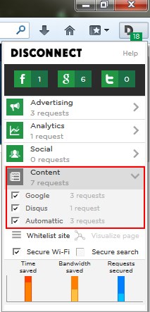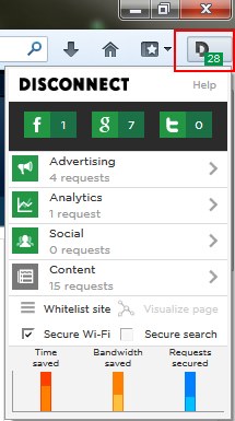 Webpages nowadays are usually cluttered up with advertisements and widgets. These elements load a secret code (scripts) to the webpage that attempts to make connection of your browser with third party sites and expose private information to these sites. Disconnect 2 helps in visualizing these tracking sites by indicating the total number of such connections in its toolbar icon, and allowing you to block them with a single mouse click.