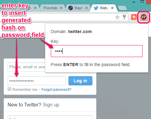 To secretly create your password, you should use its extension icon after selecting the password field of a particular account. When you have selected the password field, press its extension icon to open its pop-up. After this, option to insert key will visible. Enter the key and press Enter. This will automatically add the hash on the password field and it will remain hidden behind asterisks/bullets. Hash will not visible on the pop-up.
