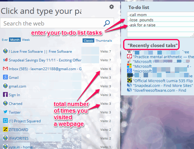 All the mostly visited webpages (so far) will be displayed with a total number of times you have opened a particular webpage. And at the right section, you can see to-do list option, and recently closed webpages list.