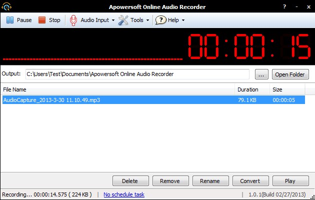 Every audio clip that’s created will be added to the large empty list in the middle of the interface. Buttons in the bottom right corner are for managing items from that list. Key features of Apowersoft Free Online Audio Recorder are: