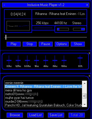 Interface of Inclusive Music Player is visible in above screenshot. It has got a pretty contrasting  UI (I liked it personally since blue is my favorite :)). While running it for the first time, you would have to use Show button to make the music playlist and sound control options visible. After this, you can add an mp3 or wav file, or a whole folder to get list of all supported music files. Here, drag n drop facility is also missing, so you have to use available Browse button to add media files. After this, you will be able to play any added file by double-clicking on it.