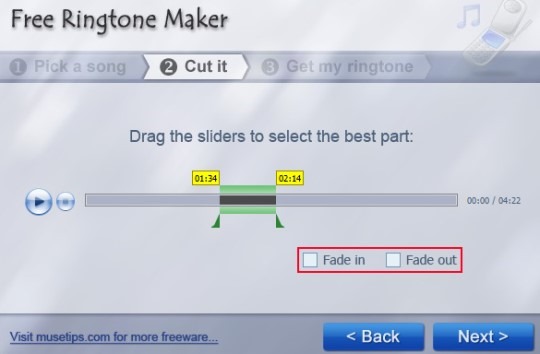 On step 1, it provides two tabs like visible in above screenshot. Select the first tab ‘Choose a Song from My Computer’. Pick a desired mp3 music file from PC and move to next step. Step 2 is the most important step as here you need to select the start and end part for output ringtone. Here is another shortcoming with this ringtone maker. It is that there is no option present to listen to selected parts as a preview to get an idea. So you have to judge yourself or need to play song with your media player side by side.